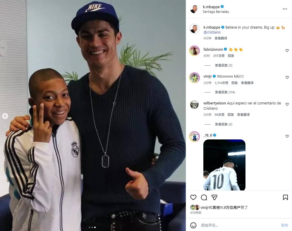 姆巴佩赛后晒出了他和偶像的合照。